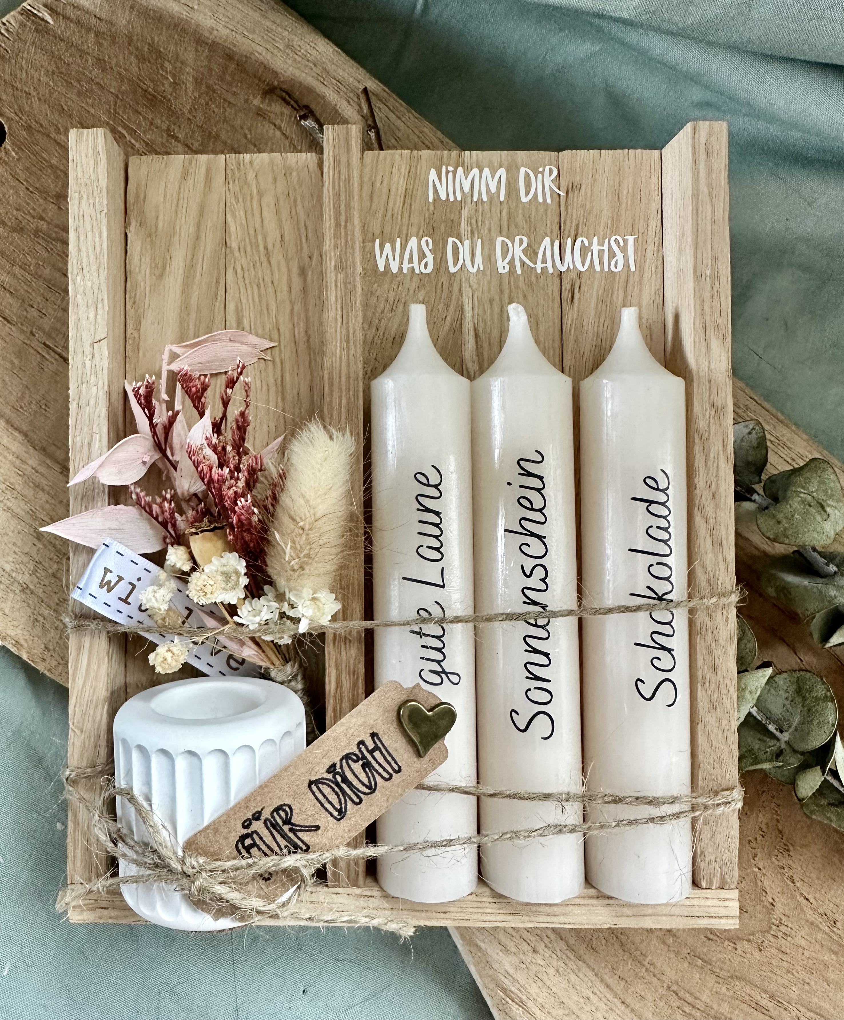 Jede Deko und jedes Geschenkset wird von mir mit viel Liebe individuell für Dich zusammengestellt.